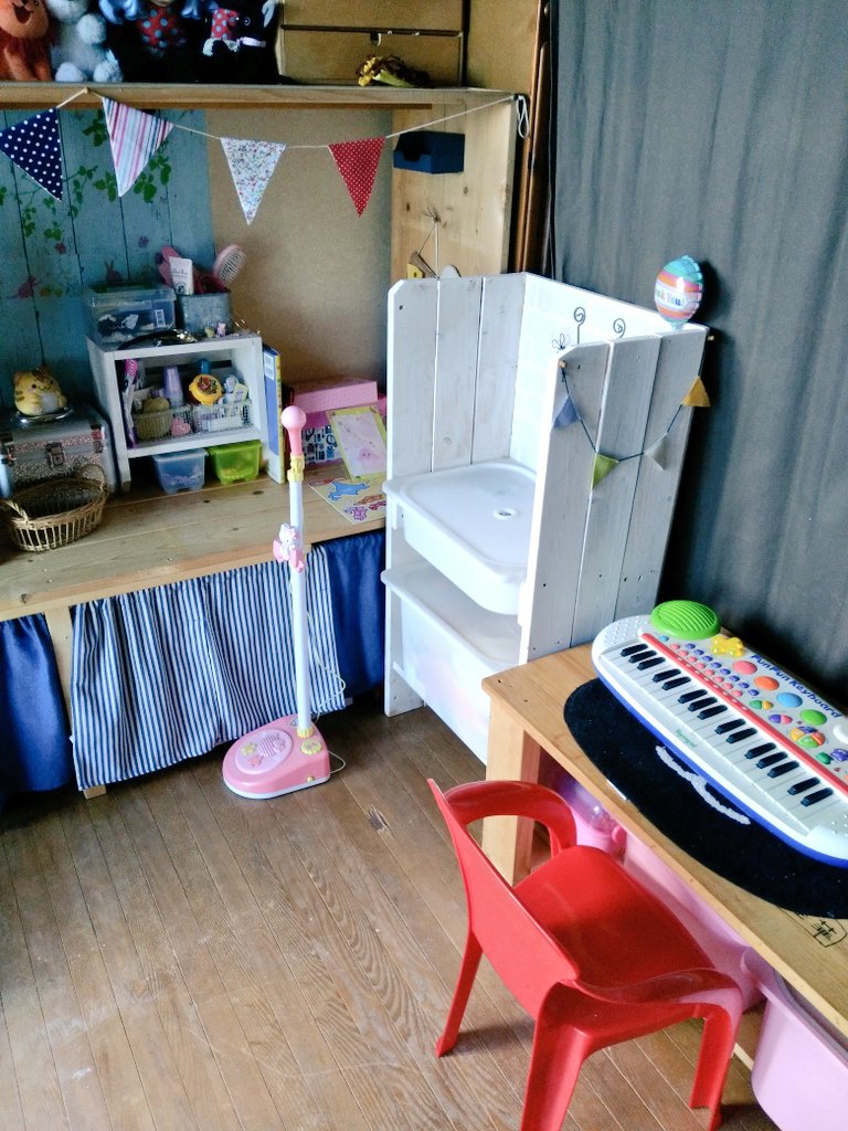 とりあえずは、棚やらベンチやらままごとの流し台が出来ただけ良しとしよう...