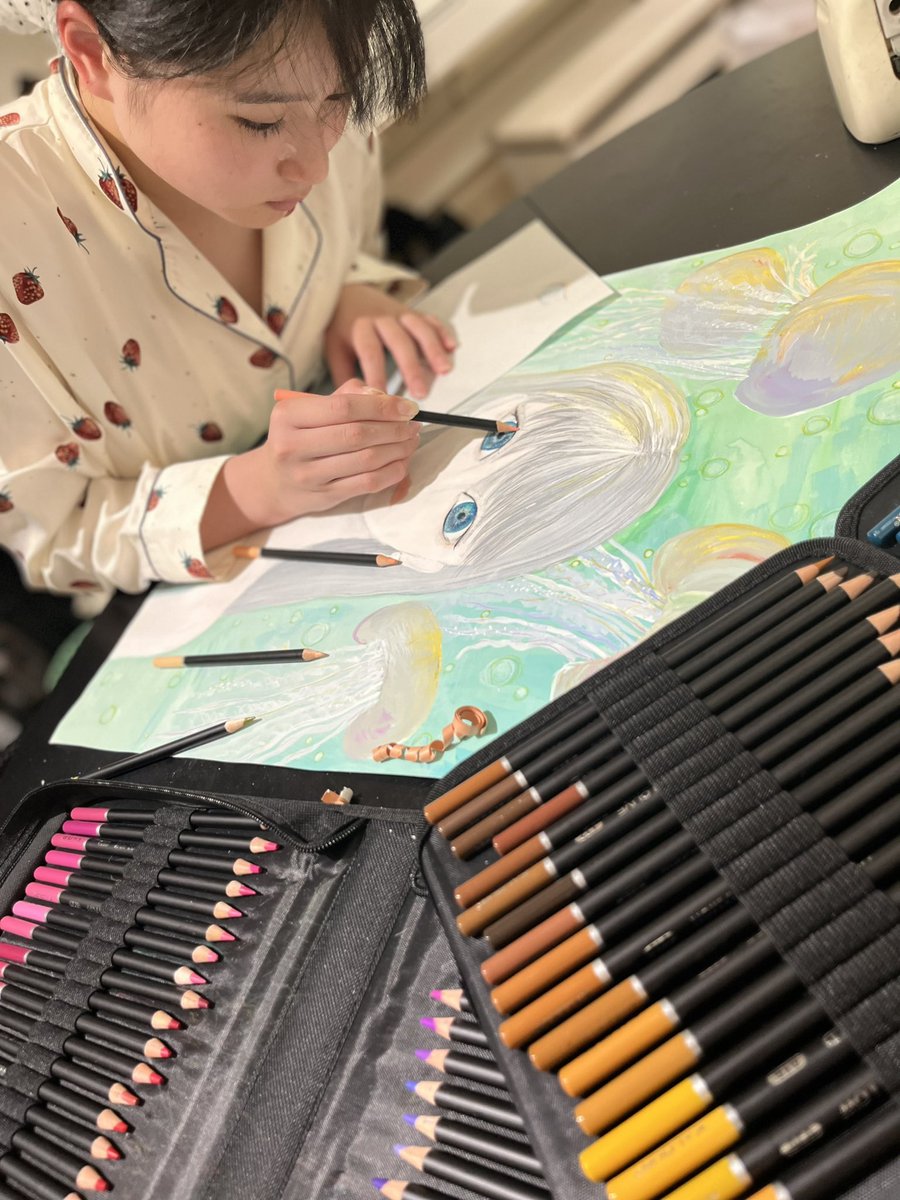 今日は起きてから課題と、部活の明日提出期限の絵に、オンラインレッスン受けてからのランニングして、絵の具乾いてから今色鉛筆で仕上げ中…