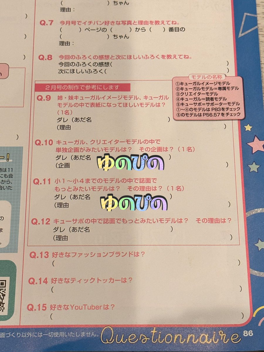 P84の読者アンケートもQ9.Q11.Q13のところに《ゆのぴの》ってかいてふうとう✉️に入れて編集部に送ってくれたらうれしいです🥹😖💗
